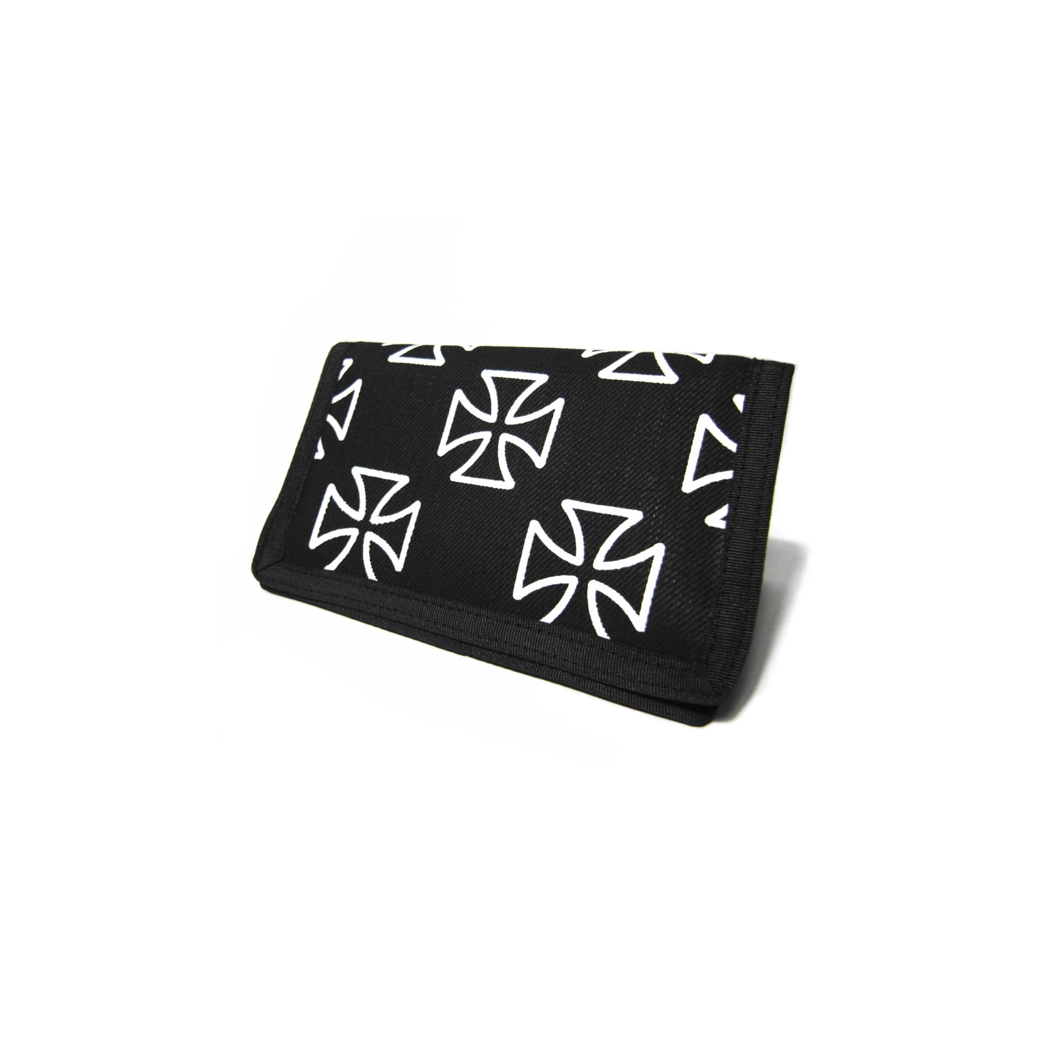 当店のアイアンクロスバンダナと同柄をブラックデニムにプリントしたオリジナルテキスタイルを使用したSHAG POUCHのリリースです(巻きタバコケース)